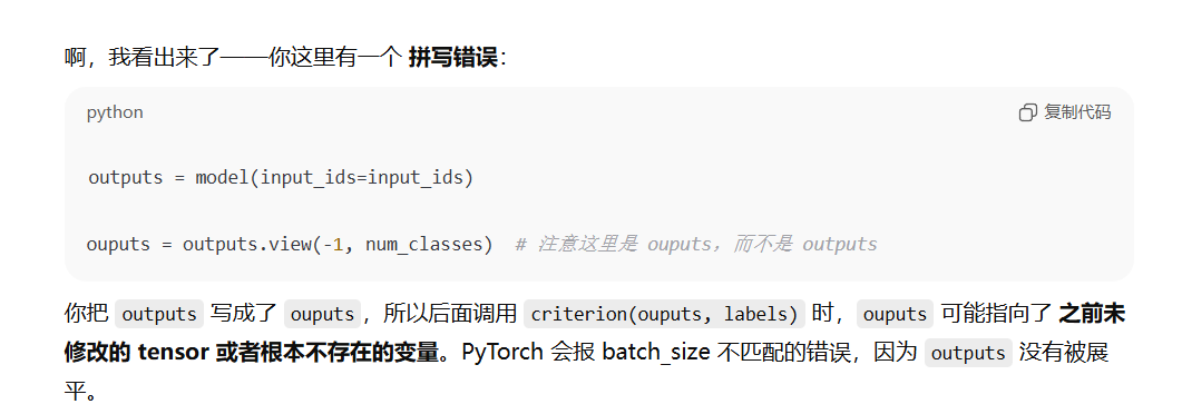 根本看不出有什么不对劲。 但是debug总是显示这里维度不匹配,问了好几遍GPT,他也没看出来,直到一遍遍排查,我把GPT说的所有可能的错误都说了,又发给他看。
